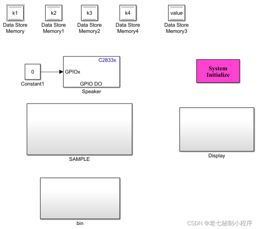 SIMULINK 的仿真模型如下图所示, 仿真步长 1e-3。 其中 K1-4 为拨码开关对应的四个引脚的变量值。 SAMPLE 子系统为扫描检测拨码开关 4 个引脚对应 IO 的输入电平。 Bin 子系统为数据处理模块, 将 IO 的输入值变成十进制数表示的二进制码形式。 System Initialize 为 OLED 液晶显示的初始化, display 模块将数据显示在 OLED 液晶屏上。