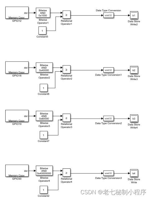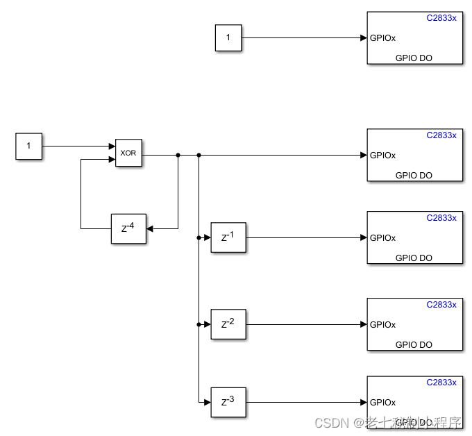 SIMULINK 中逻辑设计利用最常规的延时开通关断设计,将引脚设置为高电平还是低电平根据开发板实际情况设置 ,仿真步长设置为 1s。 仿真模型如下图所示: