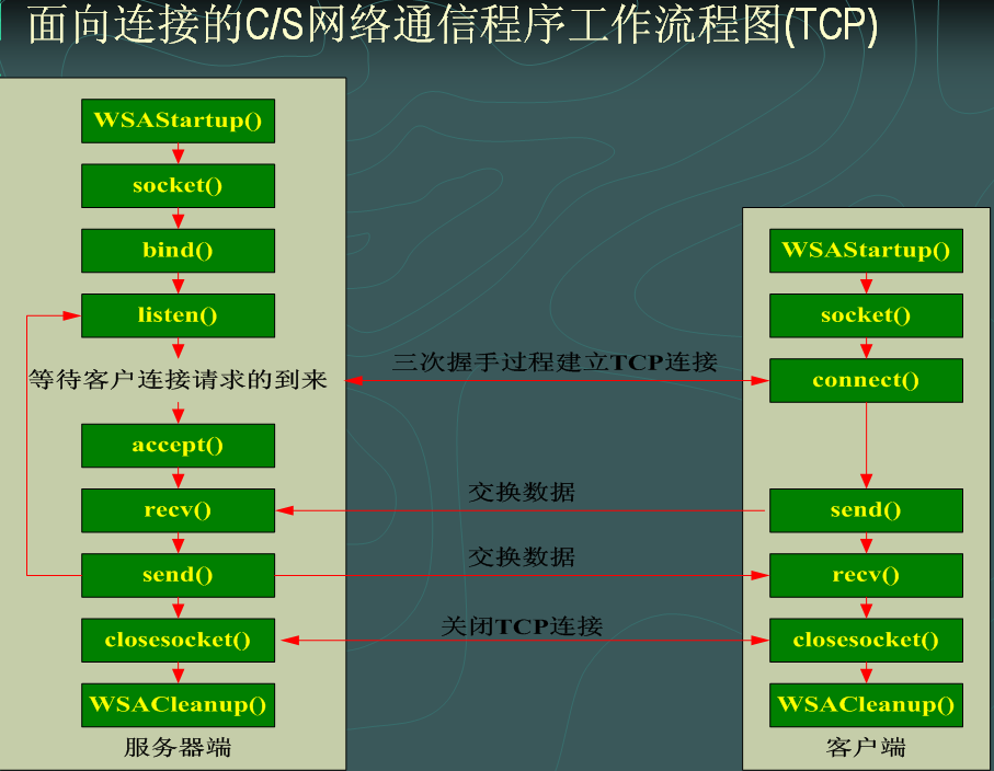 先掌握知识点,看看winsock编程基础,其实看winsock编程基础就够了 或者这个Socket过程详细解释(包括三次握手建立连接,四次握手断开连接)