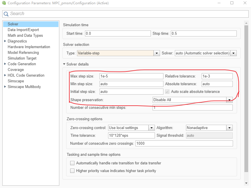 - 定步长仿真:求解器按照固定步长来进行仿真,这个步长可以根据系统的精度来进行设置。步长越小,精度越高,采样步长就越多,仿真一次需要的时间就越长。