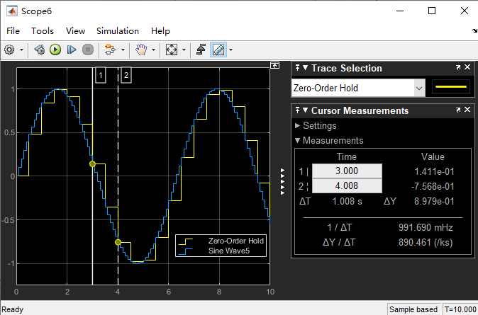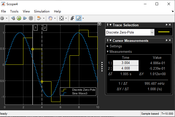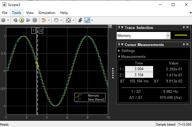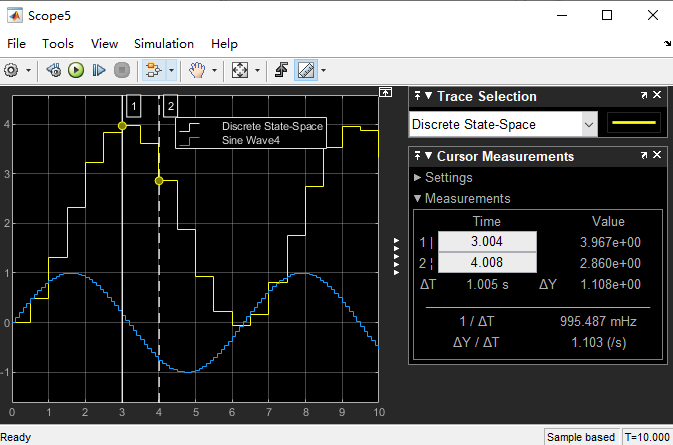 Sine Wave2的采样时间设为0.1s,运行结果如下: