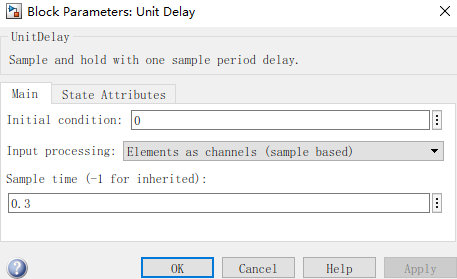 系统的输出延迟一个采样周期,通过sample time设置采样周期,比如设置为0.3s