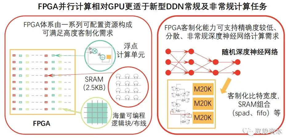 •内存接口:GPU内存接口(双倍数据传输率存储器等)带宽优于FPGA使用的DDR(双倍速率同步动态随机存储器)接口,满足机器学习频繁访问内存需求。