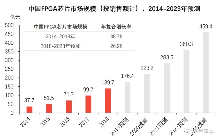 2017年起,中国FPGA迈入发展关键阶段(从反向设计 向正向设计全面过度)。本报告期内中美贸易摩擦加剧背景下,完成初期积累的中国FPGA行业中游企业面临较好发展机遇。相对全球集成电路领域超4,600亿美元市场规模,FPGA市场规模较小,存在增量释放空间。