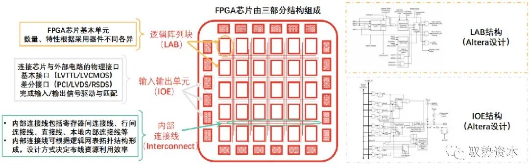 物理结构:FPGA芯片主要由三部分组成,分别为IOE(input output element,输入输出单元)、LAB(logic array block,逻辑阵列块,赛灵思定义为可配置逻辑块CLB)以及Interconnect(内部连接线)。