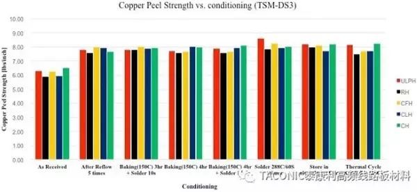 图6、TSM-DS3与不同粗糙度铜箔的剥离强度(不同可靠性测试条件)