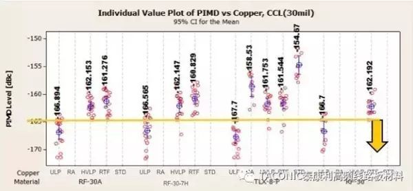 图5、TACONIC基站天线材料搭配不同铜箔的互调测试对比