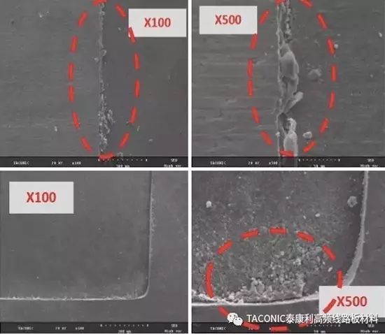 对于带状线的设计而言,除了要考虑铜箔Treated side的粗糙度之外,还需要考虑铜箔Untreated side以及线条侧壁的粗糙度,而这两方面粗糙度的大小与PCB板厂的加工工艺以及加工能力有较大的关系,需对底铜厚度选择、蚀刻药水或内层粗化药水等进行管控。否则,带状线表面的粗糙度过高,或者线条边缘的残铜(如图3)都会导致传输线路电性能指标的恶化,例如:插损、驻波、互调等。