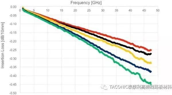 针对Above 6GHz的应用,TACONIC公司的TLY-5 (Dk2.2, Df: 0.0009@10GHz),TLY-5Z (Dk 2.2, Df: 0.0013 @10GHz) 和TSM-DS3 (Dk3.0, Df: 0.0011 @10GHz) 搭配ULP铜箔可以极大的降低线路插入损耗。