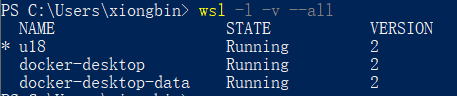 因为我使用的是WSL2的版本,所以docker desktop在安装的时候创建两个wsl子系统,使用命令wsl -l -v --all: