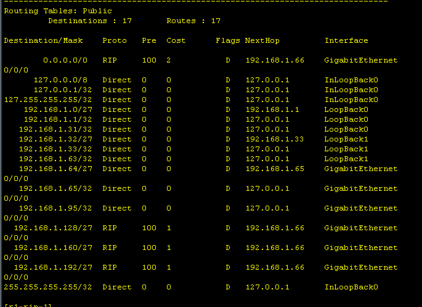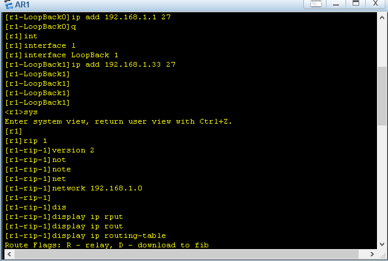 为了保证该命令是否执行,我们需要前往r1和r2查看路由表,检查是否有缺省路由
