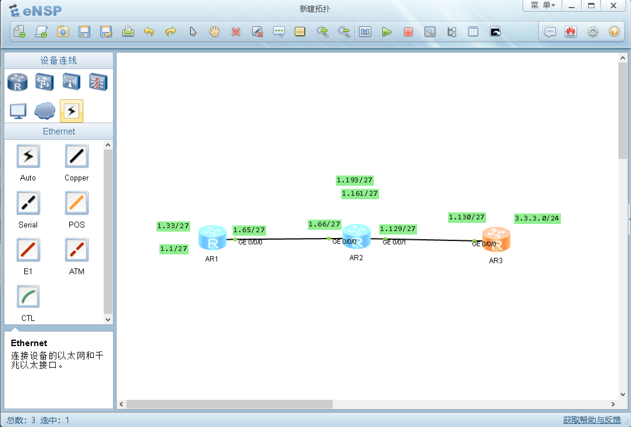 这样另外两台路由器就可以自动获取缺省路由了,可以不用通过宣告3.3.3.0/24就可以互通,具体情况如图: