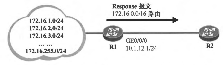 在本例中,R1处于主类网络172.16.0.0/16及192.168.12.0/24的边界,因此当它向 192.168.12.0/24网络通告172.16.1.0/24这个子网路由时,会将该子网路由汇总成主类路 由:172.16.0.0 (注意R1将该路由通过Response报文通告给R2时是不携带目的网络掩 码的)。R2收到这条路由更新后,为172.16.0.0附上该地址的缺省掩码,也就是 255.255.0.0,因此最终R2将172.16.0.0/16路由加载到路由表中,该路由的下一跳为R1。