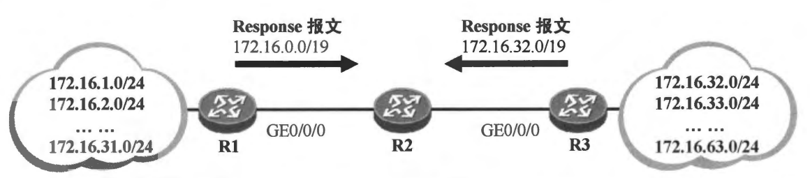 路由自动汇总功能使用起来的确颇为方便,然而正如此前所讲,该功能在某些场景中应用时可能存在问题。如下图所示,Rl、R2及R3三台路由器均运行RIPv2,其中R1及R3均处于主类网络边界。R1左侧连接着172.16.1.0/24、172.16.2.0/24……172.16.31.0/24这一系列子网,当它从GE0/0/0接口发送关于这些子网的RIP路由更新时,会将这些子网路由汇总成主类路由172.16.0.0/16再进行通告,遗憾的是R3同样会执行这个动作,它也会向R2通告172.16.0.0/16汇总路由,如此一来,R2将分别从R1及R3收到172.16.0.0/16路由的RIP更新。由于这两条汇总路由均从RIP获取,因此R2会根据度量值进行路由优选,如果它们的度量值相等,则R2会执行路由等价负载分担,也就是把这两条路由都加载到路由表中,这就会发生问题,因为到达172.16.32.0/24等子网的流量很有可能会被转发给R1从而造成流量丢失。