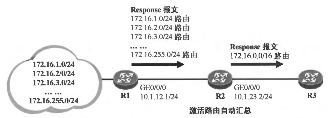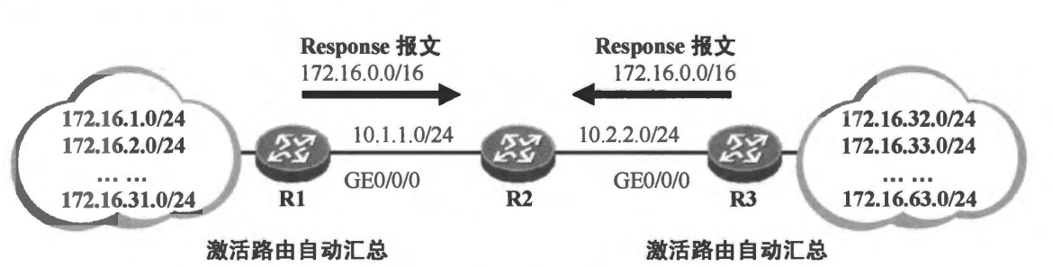 RIP路由自动汇总对本地始发的RIP路由生效,也对其他路由器通告的RIP路由生效。如图所示,如果在R1上关闭自动汇总功能,而R2激活该功能,则R1将向R2通告所有明细路由,R2收到这些路由后,将它们加载到自己的路由表,当其向R3通告这些路由时,由于激活了路由自动汇总功能,因此它仅向R3通告汇总路由172.16.0.0/16。
