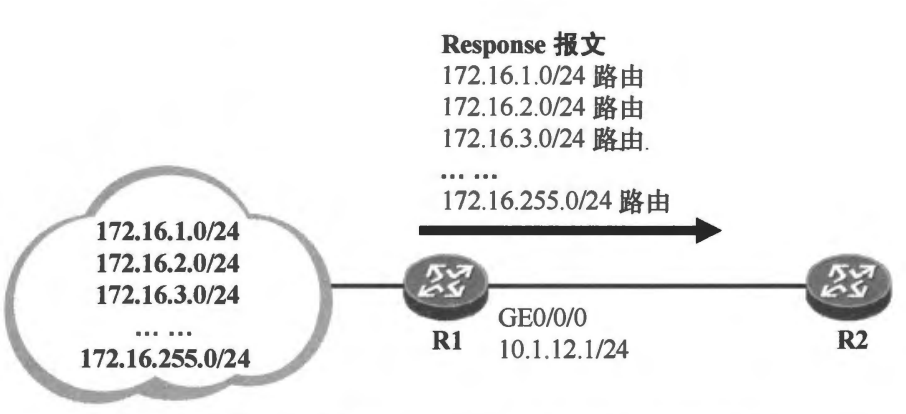 RIPv2给出了解决方案:RIP报文认证。通过在R1及R2的接口上激活RIP认证并 在两端配置相同的认证口令,可使RIP报文的交互更为安全,只有当接口上收到的RIP 报文中相关认证字段匹配本地配置的认证口令,该报文才被认为是有效的,否则被认为 是非法报文并被丢弃。