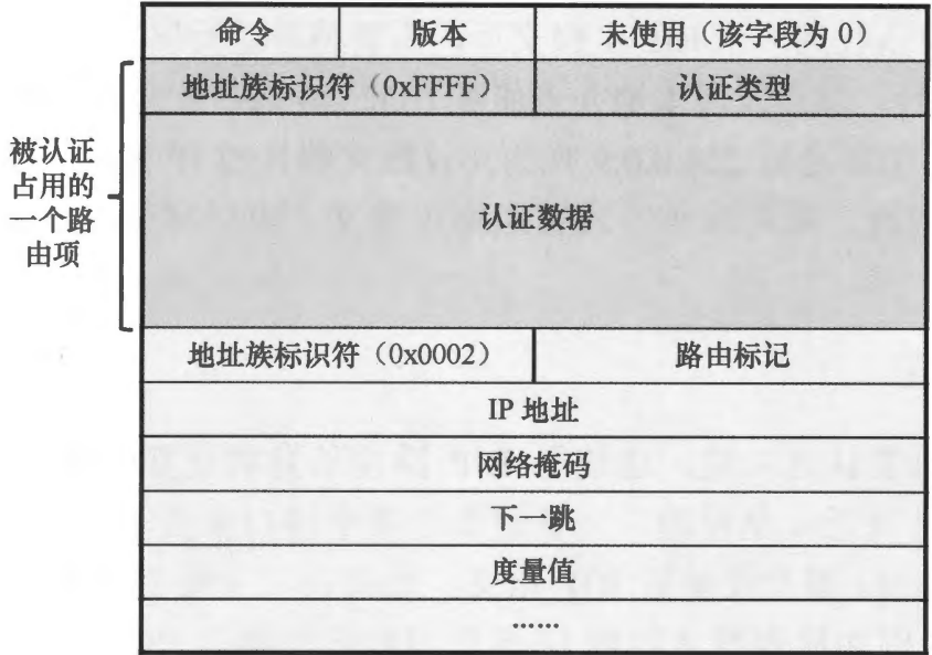 RIP认证是基于报文的,以简单(Simple)认证方式为例,路由器接口上配置RIP 报文认证后,该接口发送的RIP报文将会携带认证信息,如图所示。认证信息会占用报文的第一个路由项(该路由项的地址族标识符为0xFFFF),此时一个Response报文可携带的最大路由条目数量从25条变成24条。