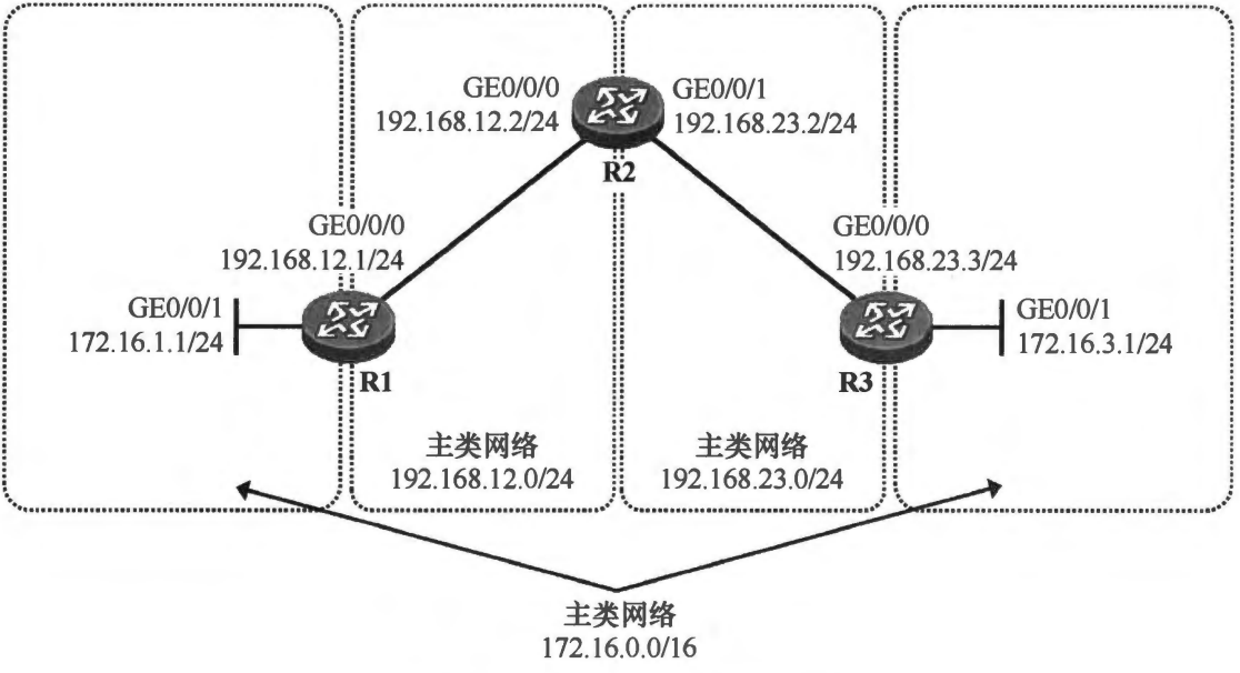 如图展示了一个部署了 VLSM的网络,R1连接着主类网络172.16.0.0/16的一个 子网——172.16.1.0/24, R3连接着该主类网络的另一个子网——172.16.3.0/24。如此一来, 172.16.0.0/16这个B类地址的两个子网被192.168.12.0/24及192.168.23.0/24这两个C类 网络地址段“隔开” 了,这种网络又被称为“不连续的主类网络”。现在网络管理员将在 Rl、R2 及 R3 上部署 RIPv1.
