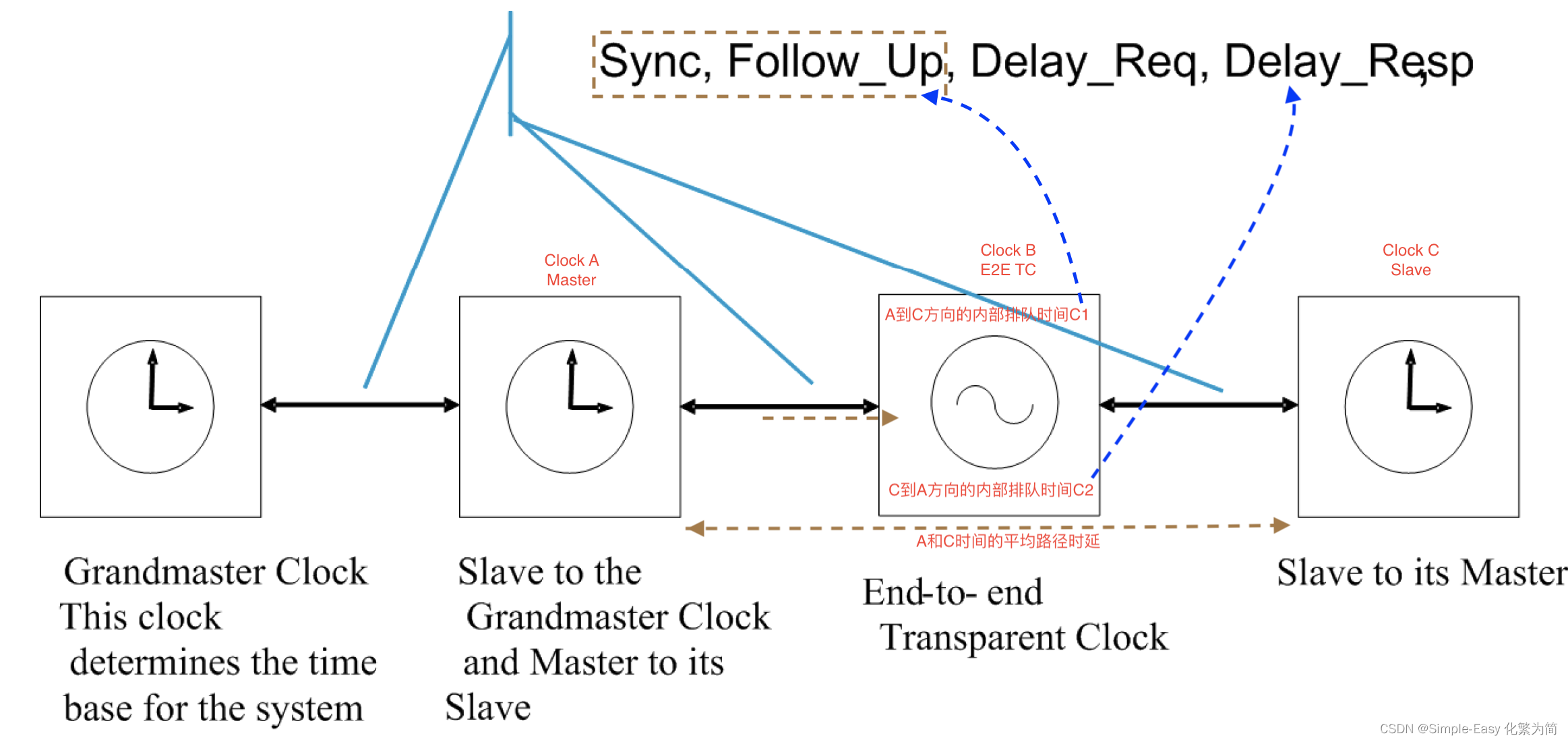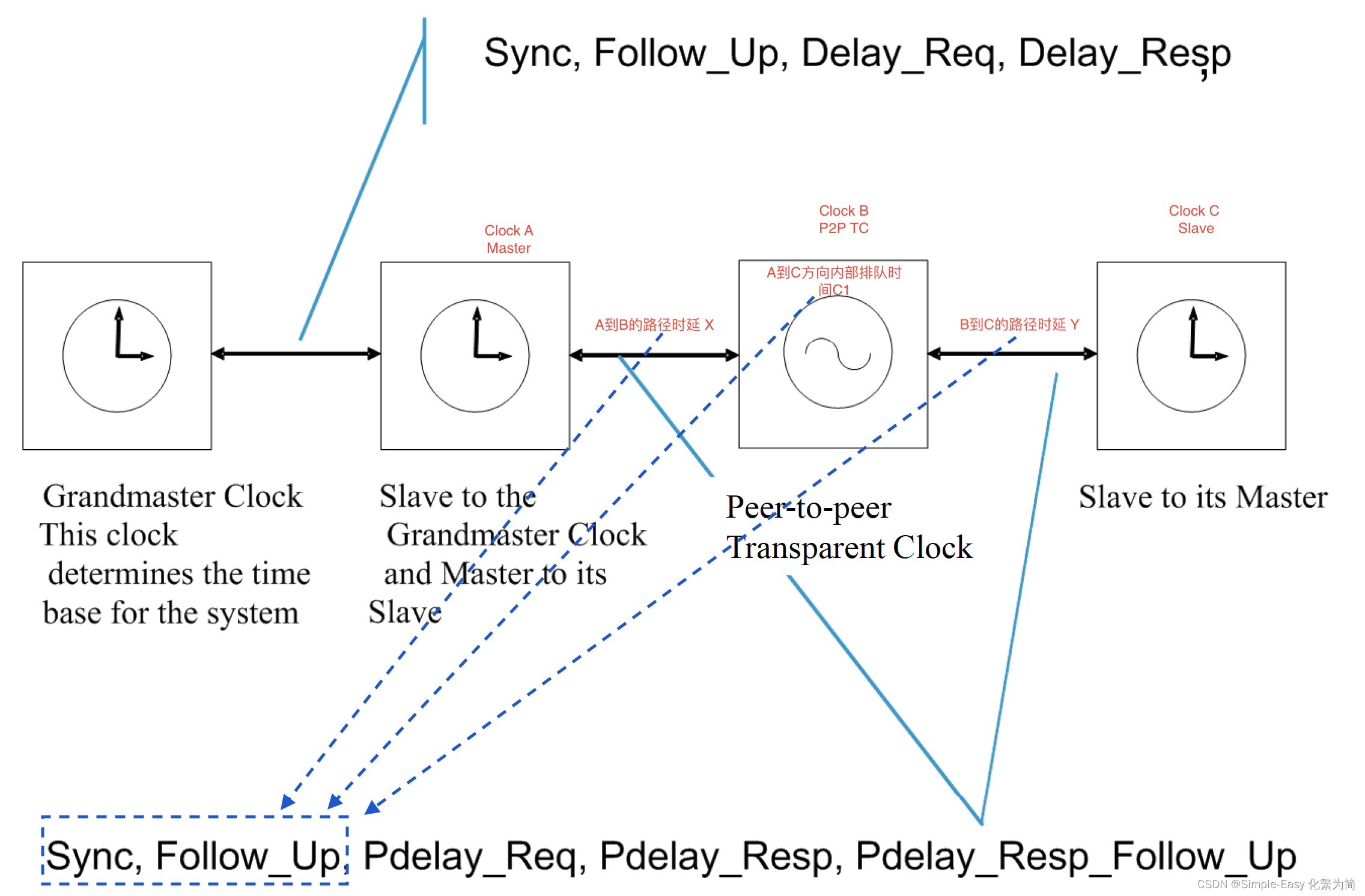P2P TC,如下图所示,Clock A和ClockC分别是master和slave时钟,ClockB是透明时钟;ClockB会使用PeertoPeer的时延测量方法(PDelayReq和PDelayResp)测出A到B的时延X,同样,ClockC会测量出B到C的时延Y;同时作为透明时钟的ClockB,需要测量Sync消息路过它的时候的内部排队时间C1,然后把C1+X放到Sync或Follow_Up消息的correctionField;当Clock C收到Sync或Follow_Up消息后,可以通过以下等式计算出和class A的时间偏差。