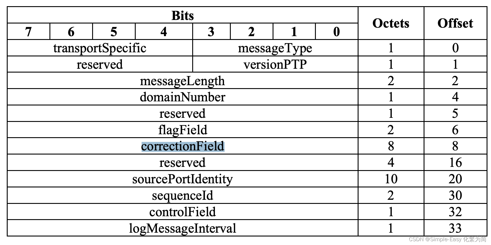 - correctionField用来存储时间信息,单位为纳秒,具体取值除以2的16次方以后是真正的值,也就是最低的16bit可以表示小于纳秒的值