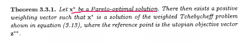 (1) The weighted Tchebycheff metric guarantees finding each and every Pareto-optimal solution when Z* is a utopia objective vector(Miettinen 1999).