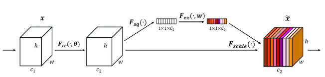 在我们采用的注意力机制是SE-Net: Squeeze-and-Excitation Networks,简称SE-Net[1],它赢得了最后一届ImageNet2017竞赛分类任务的冠军,其基本原理是对于每个输出channel,预测一个常数权重,对每个channel加权一下。结构如下图:
