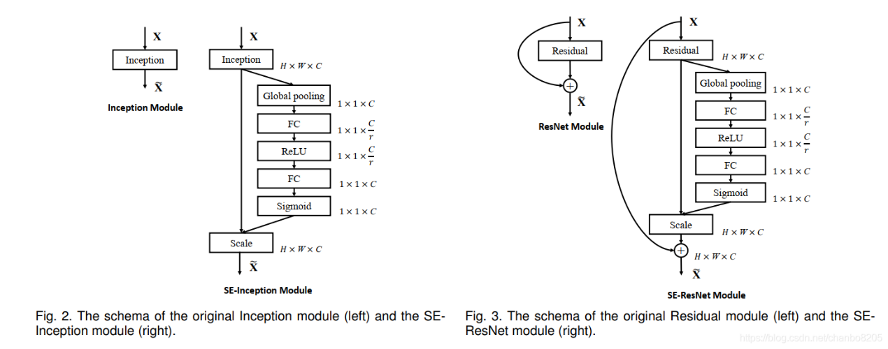 第一步每个通道H*W个数全局平均池化得到一个标量,称之为Squeeze,然后两个FC得到01之间的一个权重值,对原始的每个HxW的每个元素乘以对应通道的权重,得到新的feature map,称之为Excitation。任意的原始网络结构,都可以通过这个Squeeze-Excitation的方式进行feature recalibration,如下图。