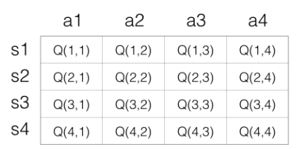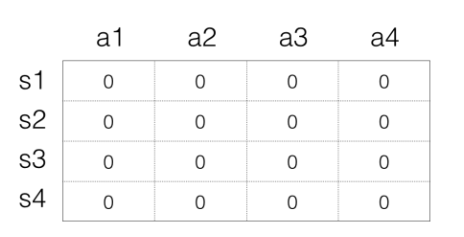 对于Q-Learning,首先就是要确定如何存储Q值,最简单的想法就是用矩阵(Q-Table),我们使用一个很大的表格,横列代表s,纵列代表a,里面的数字代表Q值,如下表示: