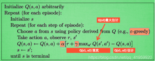 在上述算法中我们可以看出选择动作的时候使用的是ε-greedy策略,在更新Q值的公式中我们使用的是maxQ值,所以它是off-policy的,在上述过程中我们引入了如下两个概念: