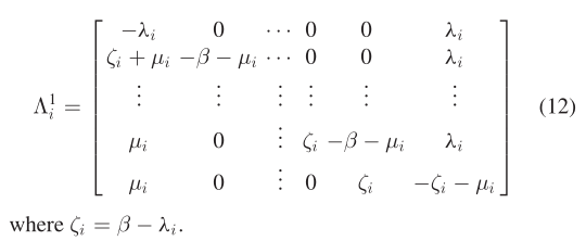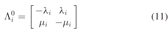 对于缓存容量,考虑容量有限和无限两种情况:缓存容量无限时,仅当存储时间超过到期时间时删除。i号内容的寿命服从的指数分布,此时缓存状态的转移概率矩阵为(由文献[29]的马尔可夫流矩阵获得):