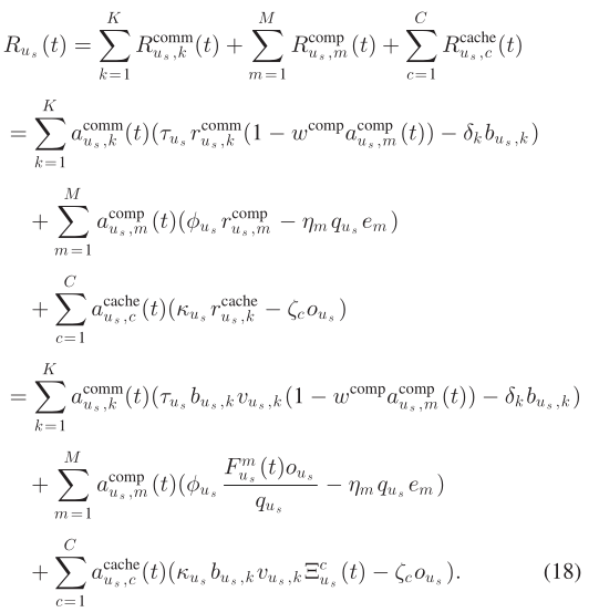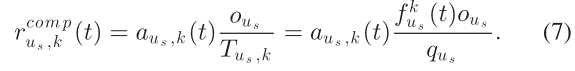 这部分的目标是构建计算任务(s为服务提供端SP,u_s为SP所管理的车的集合),此任务由车us 相关联的MEC m_k激活。第一个参数ou表示待传视频数据的大小,第二个参数表示所需CPU的周期。计算后 BS k 将转换后的数据送回车辆us。