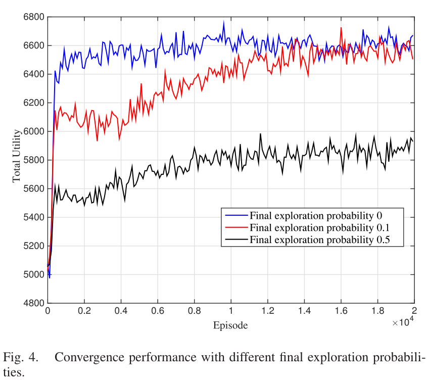 图4显示了不同探索率的性能比较,一般将初始探索率设置较大、最终探索率设置较小。图中可见探索率对系统总效用存在影响。一般来说探索率大总效用小,但是探索率小会导致陷入局部最优。下问将最终探索率设置为0。