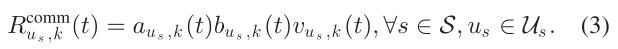 设置BS所连的车的频谱正交,因此连接到BS的链路间无干扰。车u_s的通信速率为: