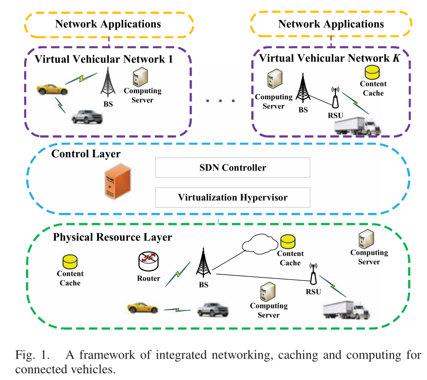 下图是一个将组网、缓存、计算集成起来的软件定义的虚拟车联网。