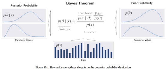 与频率统计的一个主要区别是贝叶斯假设表示为概率分布而不是参数值。因此,虽然频率论者的推理侧重于点估计,贝叶斯推理产生概率分布。贝叶斯定理通过计算后验概率来更新关于感兴趣参数的信念来自以下输入的概率分布,如图 10.1 所示: