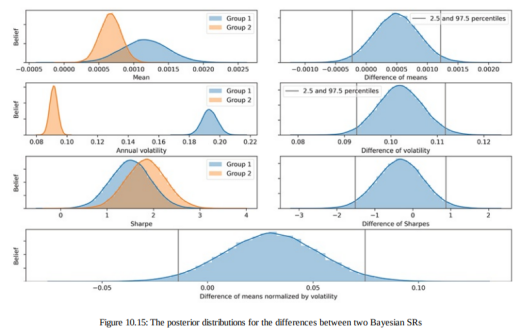 最重要的指标是底部面板中两个 SR 之间的差异。 给定完整的后验分布,从 SR 的角度可以直接直观地可视化或计算一个返回序列优越的概率。