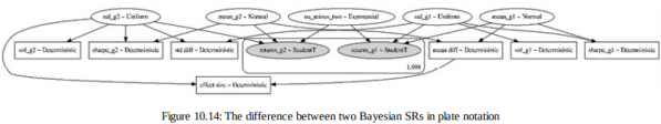 为了比较两个回报系列的表现,我们将分别对每个组的 SR 进行建模,并将效应大小计算为波动率调整回报之间的差异。对应的概率模型,如下图所示,自然更大,因为它包含两个SR,加上它们的差异: