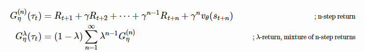 RL问题中的 return 函数G(n)t或Gλt,涉及到一些经常启发式设置的超参数,如折扣因子γ和 bootstarpping 参数λ。元梯度RL (Xu et al., 2018)将它们视为元参数,η={γ,λ},可以在agent与环境交互时在线调整和学习。因此,返回值成为η的函数,并随着时间的推移动态地适应特定的任务。