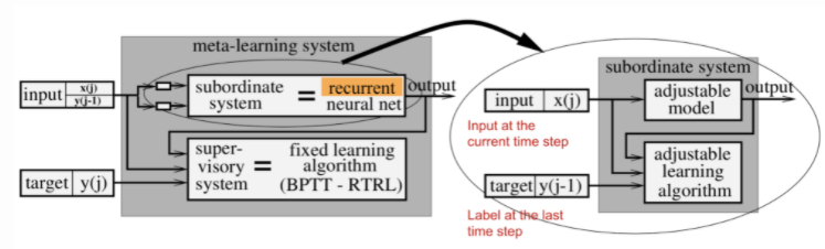 图1所示。元学习系统包括监督系统和隶属系统。从属系统是一个循环神经网络,以当前时间步长的观测值xt和上一个时间步长的标号yt−1作为输入。(图像来源:Hochreiter等人,2001)