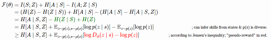 可以从状态和p(z)推断技能是多样的。根据Jensen不等式;“pseudo-reward”红色。