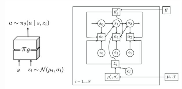 图5所示。该策略以潜伏变量zi ~ N(μ,σ)为条件,每集采样一次。每个任务具有不同的潜变量分布超参数(μi,σi),并在外环进行优化。(图片来源:Gupta等人,2018年)