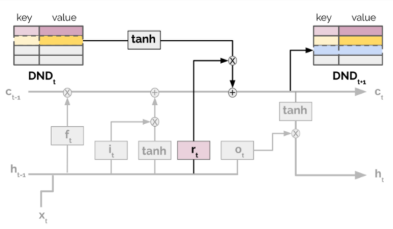 此外,情景性LSTM (Ritter等人,2018)通过DND情景记忆增强了基本的LSTM架构,它将任务上下文嵌入存储为键,而LSTM单元状态存储为值。存储的隐藏状态通过LSTM中相同的门控机制被检索并直接添加到当前的细胞状态: