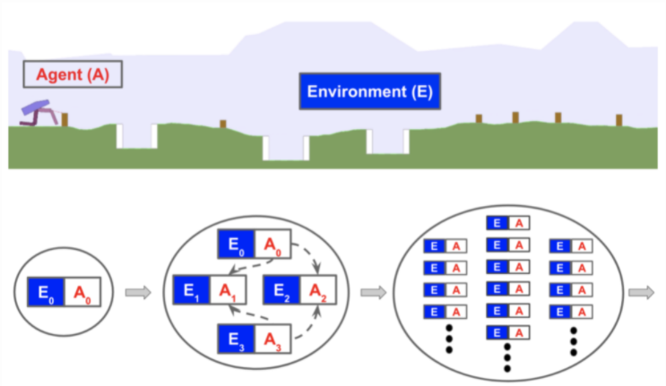 2D双足行走环境正在演变:从简单的平面到更加困难的小道,有潜在的缝隙、树桩和粗糙的地形。POET将环境挑战的产生和主体的优化结合在一起,以便(a)选择能够解决当前挑战的主体,(b)将环境演化为可解决的。该算法维护一个环境-agent对列表,并重复如下内容:
