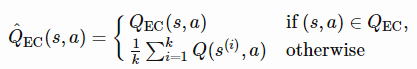 情景记忆保留了对过去事件的明确记录,并将这些记录直接用作做出新决定的参考点(就像基于度量的元学习一样)。MFEC(无模型情景控制;Blundell et al., 2016),memory被建模为一个大表格,存储状态-动作对(s,a)作为键,对应的Q-value QEC(s,a)作为值。当接收到一个新的观测s时,用非参数的方式估计Q值,取顶部k个最相似样本的平均Q值: