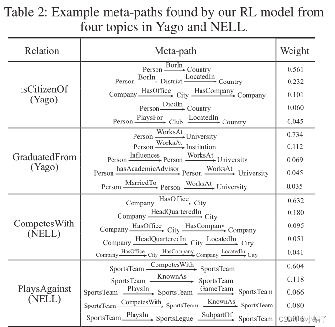 现有的手工制作方法可能无法诱导像Person influence -→Person Worksat -→University这样的元路径,而这是一个人毕业于大学的有力指标。此外,我们的RL代理还发现了长长度的元路径,如NELL中的CompetesWith的第五个元路径。有趣的是,我们还发现我们的方法能够找到下义关系。以CompetesWith为例,元路径Company HasOffice−→City中出现的关系HasOffice是总部的下属关系。