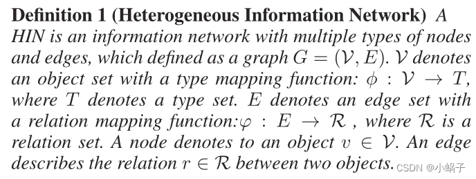 HIN是一个包含多种类型节点和边的信息网络,定义为图G = (V, E)。V表示一个对象集,它有一个类型映射函数:φ: V→T,其中T表示类型集。E表示一个带有关系映射函数的边缘集:其中n: E→R,其中R是一个关系集。节点表示对象v∈V,边描述两个对象之间的关系r∈R