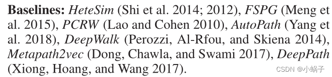 分析和执行HINs中的数据挖掘任务,Sun等(2009;2011年)提出了元路径的概念,用于捕获语义信息和表达两个对象的复杂相关性。随后,已经发表了大量论文,涉及HIN中许多数据挖掘任务中的元路径,如相似性度量(Sun et al. 2011;Wang et al. 2016),链接预测(Shi et al. 2014;Cao, Kong, and Philip 2014),表征学习(Dong, Chawla, and Swami 2017;Cao, Kong, and Philip 2014),等等。