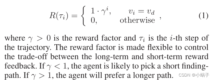 其中γ >0为奖励因子,τi为轨迹的第i步。通过灵活的奖励因素控制长期和短期奖励反馈之间的权衡。如果γ < 1,代理可能会选择一个短的寻找路径。如果γ >为1,代理将选择较长的路径。