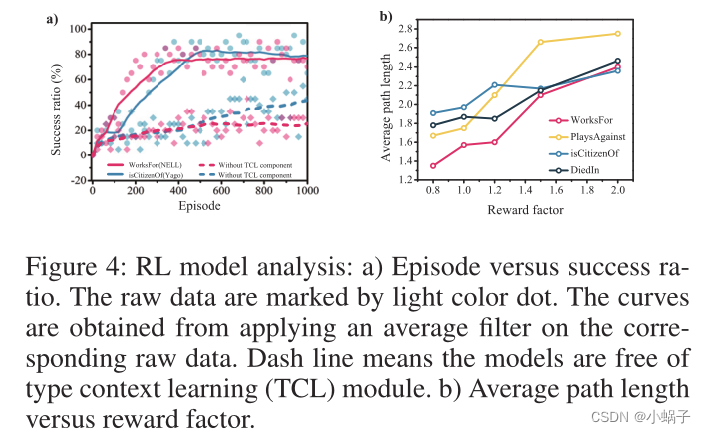 图4:RL模型分析:a)事件与成功率。原始数据用浅色点标记。这些曲线是通过对相应的原始数据进行平均滤波得到的。虚线表示模型没有类型上下文学习(TCL)模块。b)平均路径长度与奖励因子。