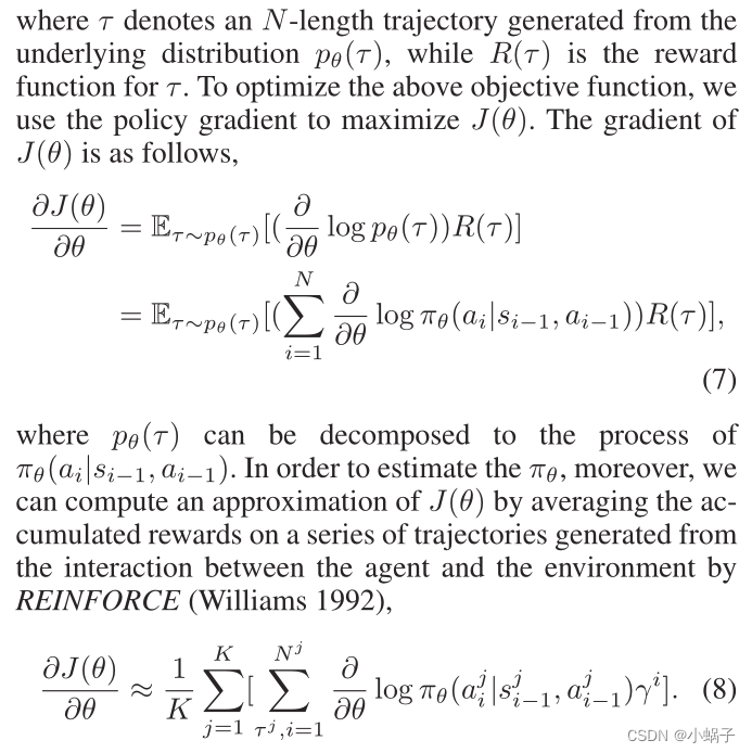 通过REINFORCE (Williams 1992),在行为主体与环境之间的相互作用所产生的一系列轨迹上积累的奖励